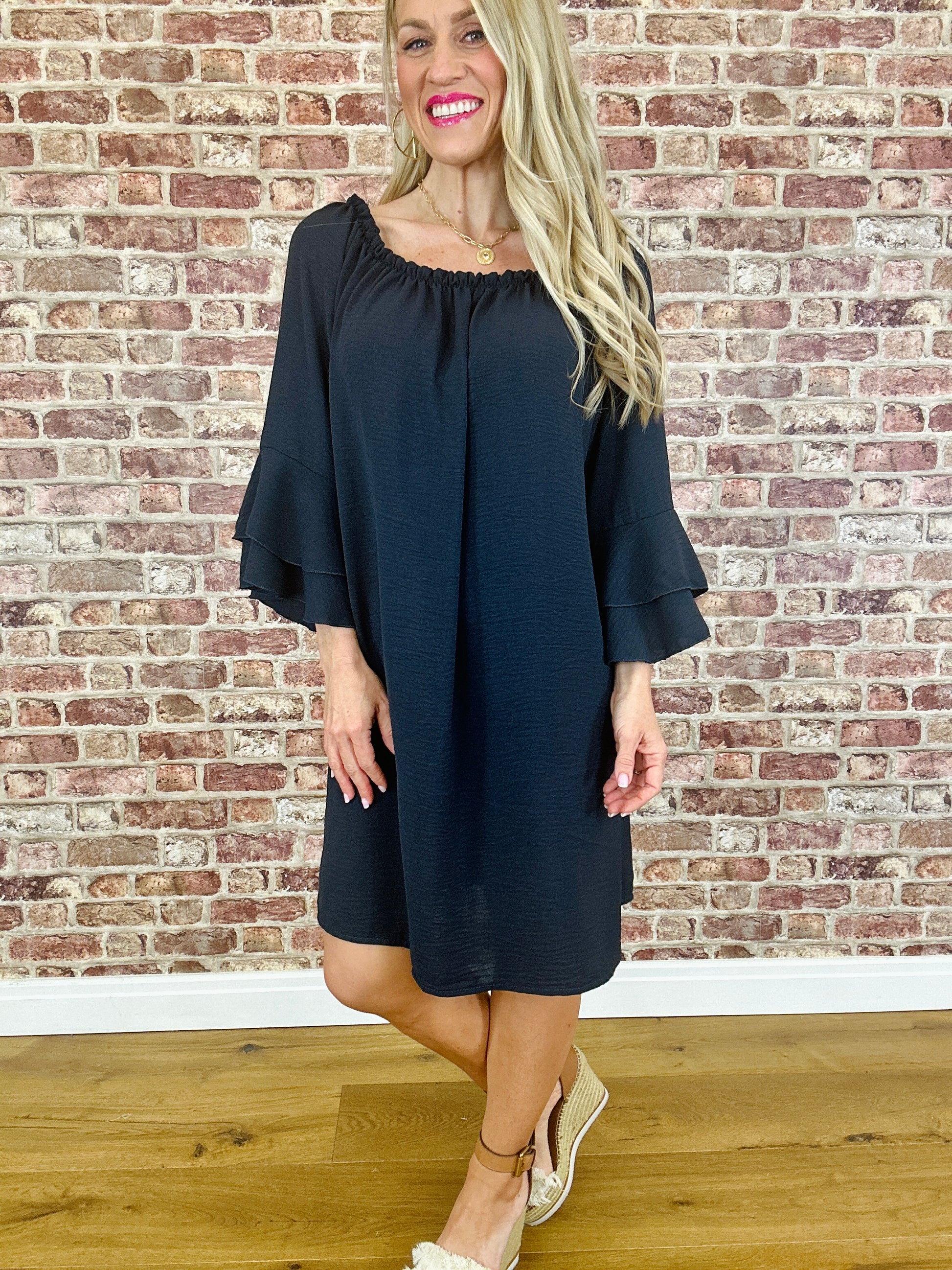 - Stretch neckline to wear on shoulder or bardot style